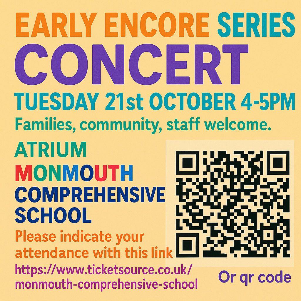 We are delighted to invite families and members of our community to the Early Encore Series Concert on Tuesday 21st October, 4–5pm, in the Atrium, Monmouth Comprehensive School.